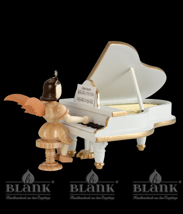 Bei diesem Ensemble hat der kleine Faltenrockengel an einem eleganten Flügel Platz genommen, um eine liebliche Weihnachtsmelodie von seinem Notenblatt zu spielen. Diese Handarbeit aus unserer Engelwerkstatt in Grünhainichen bezaubert durch ihre vielen, sorgfältig gefertigten Details. Während der Faltenrockengel mit seinem Hocker aus naturbelassenem Holz besteht, ist das Instrument in edlem weiß gestaltet und mit goldenen Details abgesetzt. Vervollständigen Sie Ihre Weihnachtsdekoration mit diesem prächtigen kleinen Kunstwerk.