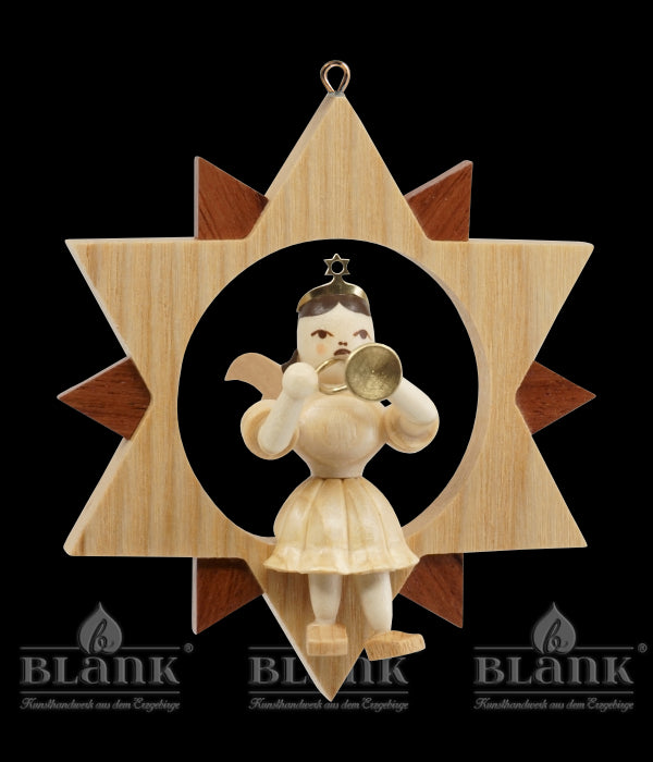 Dieser bezaubernde kleine Faltenrockengel® mit goldenem Sternendiadem sitzt vergnügt auf einem zweifarbig gestalteten Stern und spielt liebliche Melodien auf seiner Trompete. Die Freude ist ihm dabei ins Gesicht geschrieben. Das Kunstwerk wurde in unserer Engelwerkstatt in Handarbeit gefertigt und besteht aus hellem und dunklem Naturholz. Der Stern ist an der Spitze mit einer Metallöse versehen, sodass er sich mit einem Band aufhängen lässt. Die Details des lieblichen Faltenrockengels im Stern sind aufwendig gestaltet. Zieren Sie Ihren Weihnachtsbaum mit diesem filigranen Kunstwerk aus dem Erzgebirge oder hängen Sie die Figur als Dekoration in Ihr Fenster.