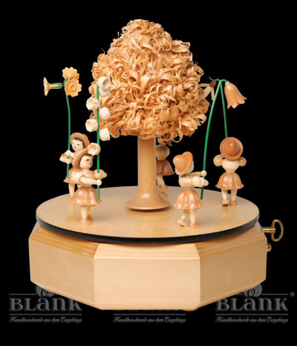 Diese zauberhafte Spieldose ist ein Stück traditionsreiche Handwerkskunst aus dem Erzgebirge und bringt Ihnen den Frühling ins Haus. Fünf Blumenkinder tanzen um eine Linde und halten wunderschöne Frühblüher in den Händen - jede der fein gearbeiteten Figuren trägt eine andere Blume. Die Spieldose zeigt die sorgsam verarbeiteten Naturhölzer und das Spielwerk lässt die kleinen Blumenkinder nach dem "Blumenwalzer" tanzen. Erfreuen Sie sich an einem Qualitätsprodukt aus Grünhainichen, das die Marke "Echt Erzgebirge®" trägt.