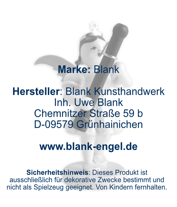 Dieser kleine Kurzrockengel mit dem einzigartigen Faltenröckchen von BLANK Kunsthandwerk spielt verträumt auf seinem Fagott. Er begleitet damit das große Engelorchester, das in aufwendiger Handarbeit in unserer Engelwerkstatt im Erzgebirge entsteht. Die naturfarbene Figur ist aus verschiedenen heimischen Hölzern hergestellt und wird in ca. 135 Arbeitsschritten mit viel Liebe zum Detail zusammengesetzt. Malerinnen verleihen dem Engel schließlich einen freundlichen Ausdruck, sodass er jeden allein, oder im Ensemble, verzaubern kann.