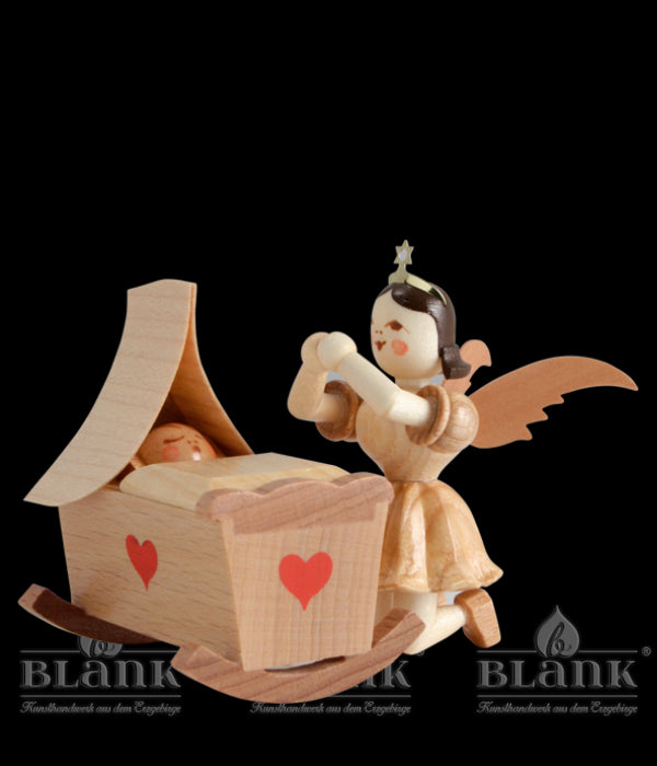 Eine zauberhafte Darstellung, die zu Herzen geht, ist dieser Faltenrockengel, der vor einem Kind in einer Wiege kniet. Die berühmte Handwerkskunst aus dem Erzgebirge zeigt sich hier in ihrer traditionellen Form mit einem sehr gefühlvollen Ausdruck. Als Symbol der Liebe und des Friedens kann Sie der Faltenrockengel mit der hübschen kleinen Wiege durch die ganze Adventszeit begleiten und ein festlicher Weihnachtsschmuck sein. Er eignet sich aber auch als liebevolles Geschenk zur Geburt oder zur Taufe.