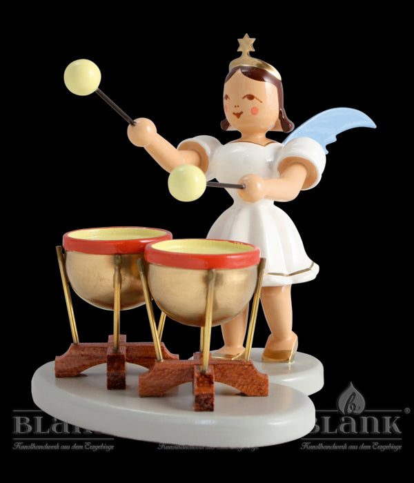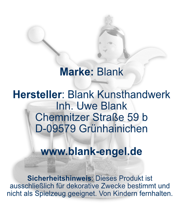 Dieser kleine Kurzrockengel mit dem einzigartigen Faltenröckchen von BLANK Kunsthandwerk spielt kraftvoll auf zwei imposanten Kesselpauken. Er begleitet damit das große Engelorchester, das in aufwendiger Handarbeit in unserer Engelwerkstatt im Erzgebirge entsteht. Die farbige Figur ist aus verschiedenen heimischen Hölzern hergestellt und wird in ca. 150 Arbeitsschritten mit viel Liebe zum Detail zusammengesetzt. Malerinnen verleihen dem Engel schließlich einen freundlichen Ausdruck, verzieren sein Kleid mit einem goldenen Saum und geben ihm goldene Schuhe und blaue Flügel. Lassen Sie sich von diesem erzgebirgischen Original verzaubern.