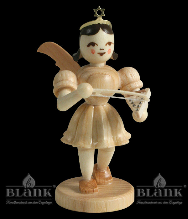 Dieser Kurzrockengel streicht auf einem Psalter, der Urform von Zither, Harfe und Inspiration für das Cembalo. Der dreieckige Resonanzkörper, der in seiner realen Entsprechung mit Saiten bespannt ist, ist mit einer filigranen Note verziert und wird mit einem aufwendig gefertigten Bogen gestrichen. Das sehr sphärisch klingende Instrument wurde im Mittelalter häufig auch von Hand gezupft und wird im Lied "Lobe den Herren, den mächtigen König der Ehren" besungen.