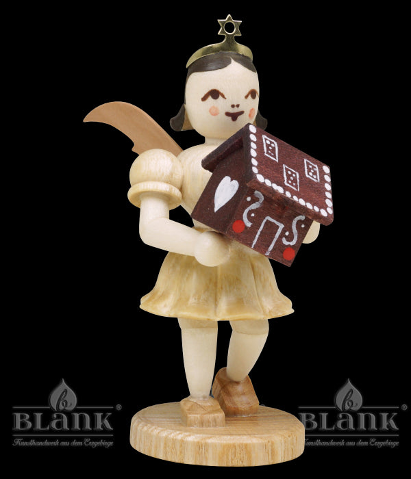 Dieser naturfarbene Kurzrockengel präsentiert voller Stolz sein kleines dunkelbraunes Pfefferkuchenhaus, das er soeben zusammengesetzt und reichlich verziert hat. Das Häuschen ist von allen Seiten liebevoll handbemalt worden. Auf diese Weise ist jedes Pfefferkuchenhaus ein klein wenig anders und ganz individuell. Die Figur entsteht in aufwendiger Handarbeit aus heimischen Hölzern in unseren Engelwerkstätten in Grünhainichen. "Echt Erzgebirge. Holzkunst mit Herz®".