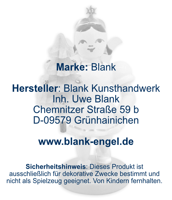 Zum 70. Firmenjubiläum von Blank Kunsthandwerk präsentieren wir Dir die farbig gestaltete Sonderedition: den Kurzrockengel mit Bäumchen und saphirblauen Preciosa-Kristallen. Der Engel trägt ein handbemaltes weißes Kleid mit goldenen Akzenten und hält ein filigran gefertigtes Tannenbäumchen in den Händen. Die saphirblauen Kristalle, die das Bäumchen schmücken, verleihen der Figur einen eleganten und festlichen Glanz.