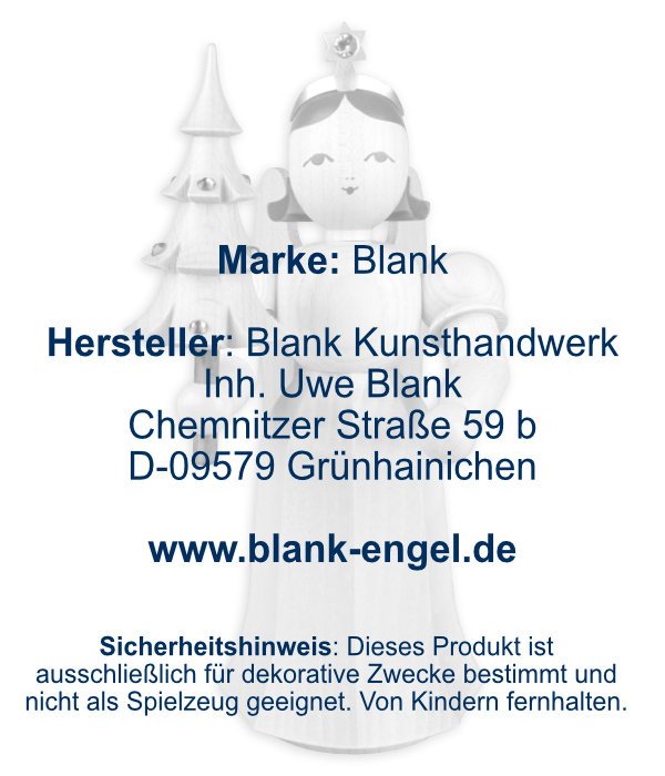 Zum 70. Firmenjubiläum von Blank Kunsthandwerk präsentieren wir die limitierte Sonderedition: den 22 cm großen naturfarbenen Langrockengel mit Bäumchen und saphirblauen Preciosa-Kristallen. Der Engel trägt ein schlichtes, Faltengewand aus naturbelassenem Holz, das die Maserung des Materials wunderschön zur Geltung bringt. In seinen Händen hält er ein filigran gearbeitetes Tannenbäumchen, das mit saphirblauen Kristallen geschmückt ist und der Figur eine festliche Ausstrahlung verleiht.