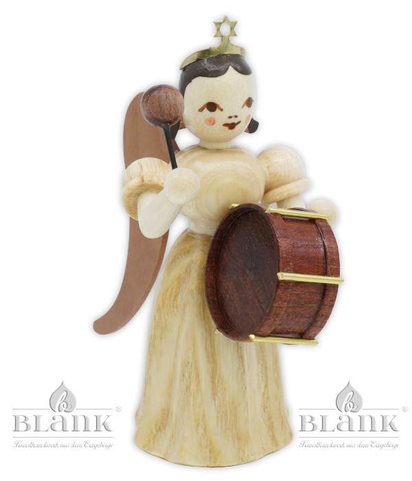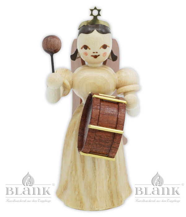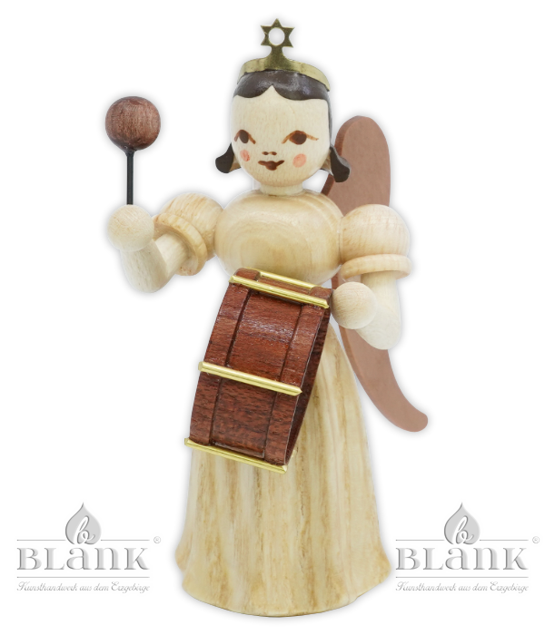 Der Faltenlangrockengel mit Pauke verbindet das klassische Faltenröckchen mit einer eleganten, bodenlangen Form – ein besonderer Look, der sofort ins Auge fällt. Er ist etwa 7 cm groß, aus Naturholz gefertigt und trägt die Pauke vor dem Körper, während der Schlägel erhoben ist. Es wirkt, als würde er gleich feierlich den ersten Einsatz geben. Natürlich trägt auch er unser Qualitätssiegel Echt Erzgebirge. Holzkunst mit Herz. – echtes Handwerk für dein Zuhause.