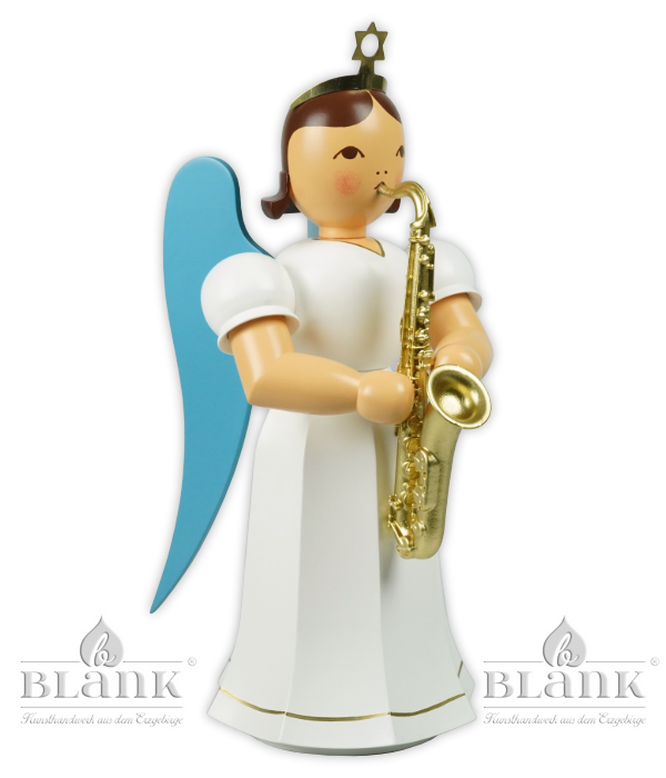 Dieser farbige 22 cm-Langrockengel begeistert mit einem außergewöhnlich detailreichen Saxophon: weich geschwungene Linien, feine Klappen und ein goldener Glanz machen das Miniaturinstrument fast zum Original. Die elegant bemalte Robe, himmelblauen Flügel und das goldene Sterndiadem entstehen in sorgfältiger Handarbeit und verleihen der Figur ihre besondere Ausstrahlung. Ein eindrucksvolles Sammlerstück und ein schönes Beispiel echter erzgebirgischer Handwerkskunst von BLANK Kunsthandwerk.