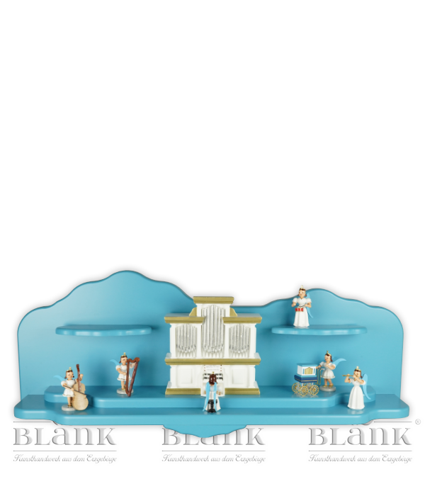 Dieses farbige Wolken-Regal ist 71 cm breit und 25 cm hoch, bietet Platz für mindestens 25 Engel, hat auf der untersten Ebene zwei Stufen sowie zwei kleine Wolken an der Rückwand und kann an der Wand befestigt oder frei aufgestellt werden, ein Bild zeigt ein dekoriertes Beispiel mit Figuren, das zweite das Regal pur.